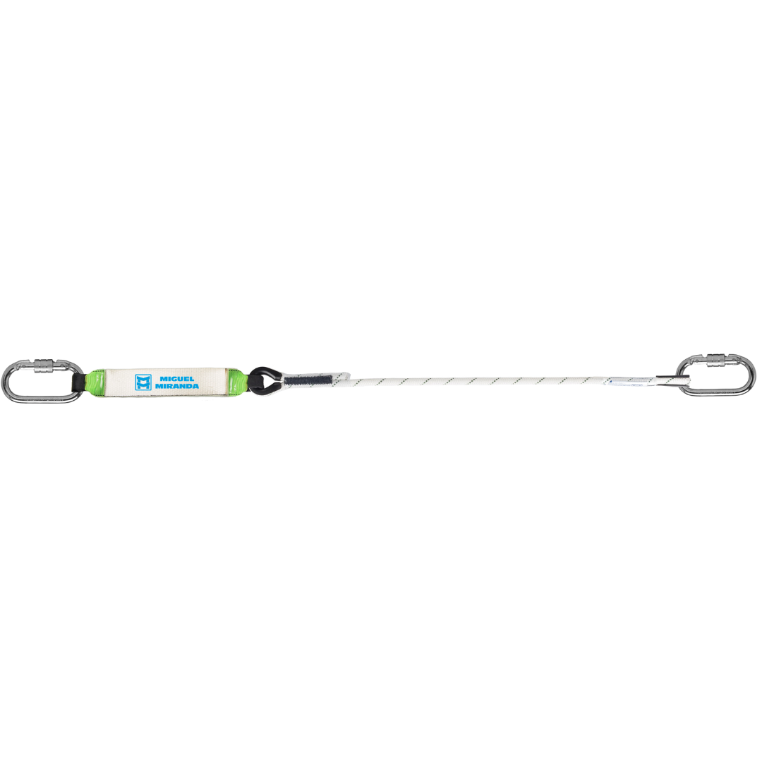 Absorbedor de energía MIRA AB10 con elemento de amarre incorporado de cuerda semiestática de 11 mm. Con 2 mosquetones de acero con cierre de virola de rosca.