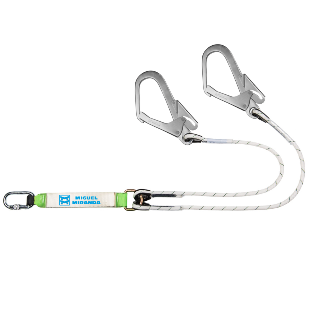 Absorbedor de energía MIRA AY15 con doble ramal de cuerdas semiestáticas de 11 mm. Con mosquetón de acero con cierre de virola de rosca y 2 ganchos de acero con 55 mm de apertura.