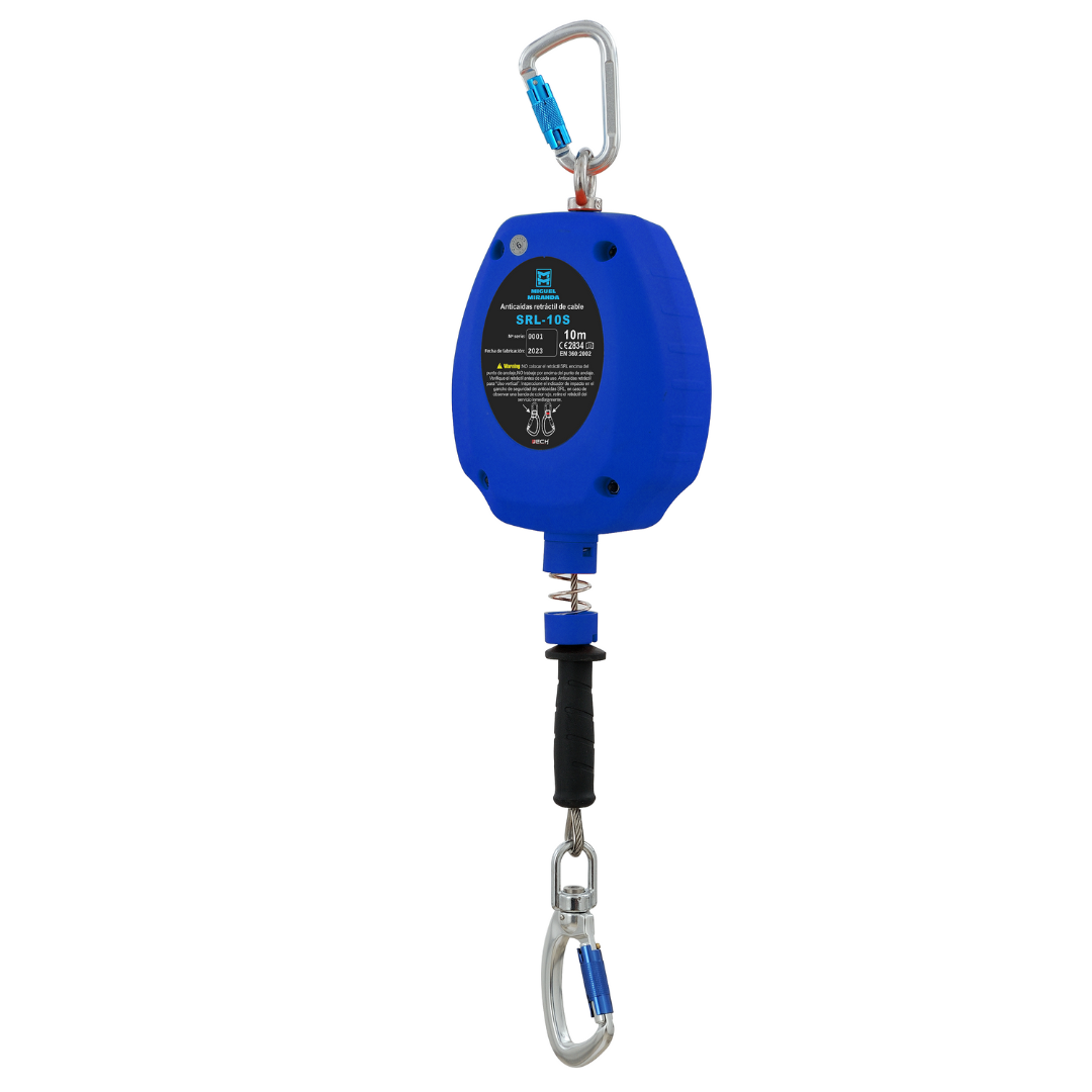 Anticaídas retráctil de cable de acero inoxidable de 10 metros con gancho de acero giratorio con cierre y bloqueo automático y asa para facilitar su transporte.