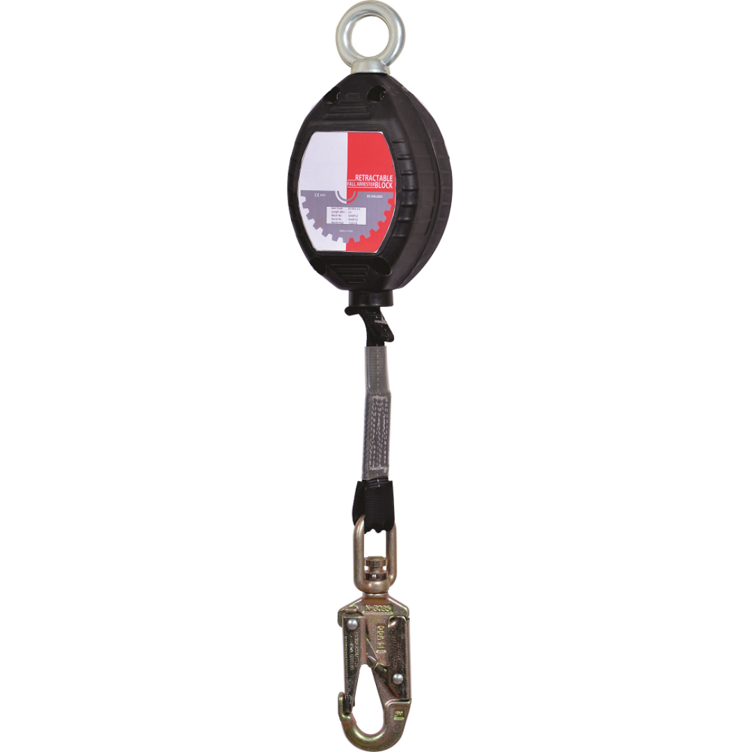 Anticaídas retráctil SF-RFA-3,5W con cinta de 3,5 metros y gancho de acero giratorio con cierre y bloqueo automático.