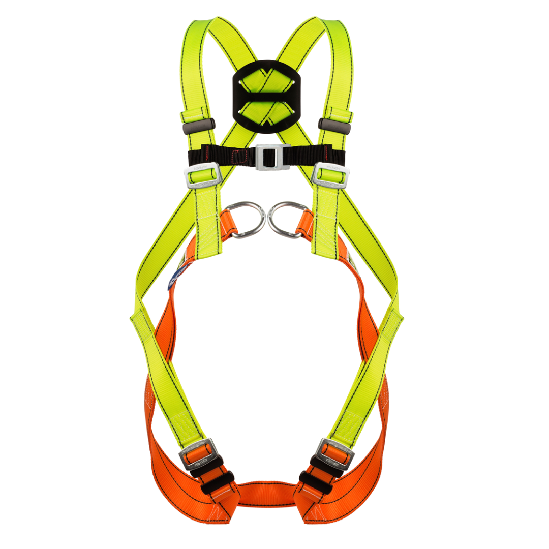 Arnés anticaídas MIRA 10 con 2 puntos de enganche anticaídas, uno dorsal y otro pectoral. Hombreras y perneras regulables, broche pectoral metálico. Con bolsa porta-equipos.