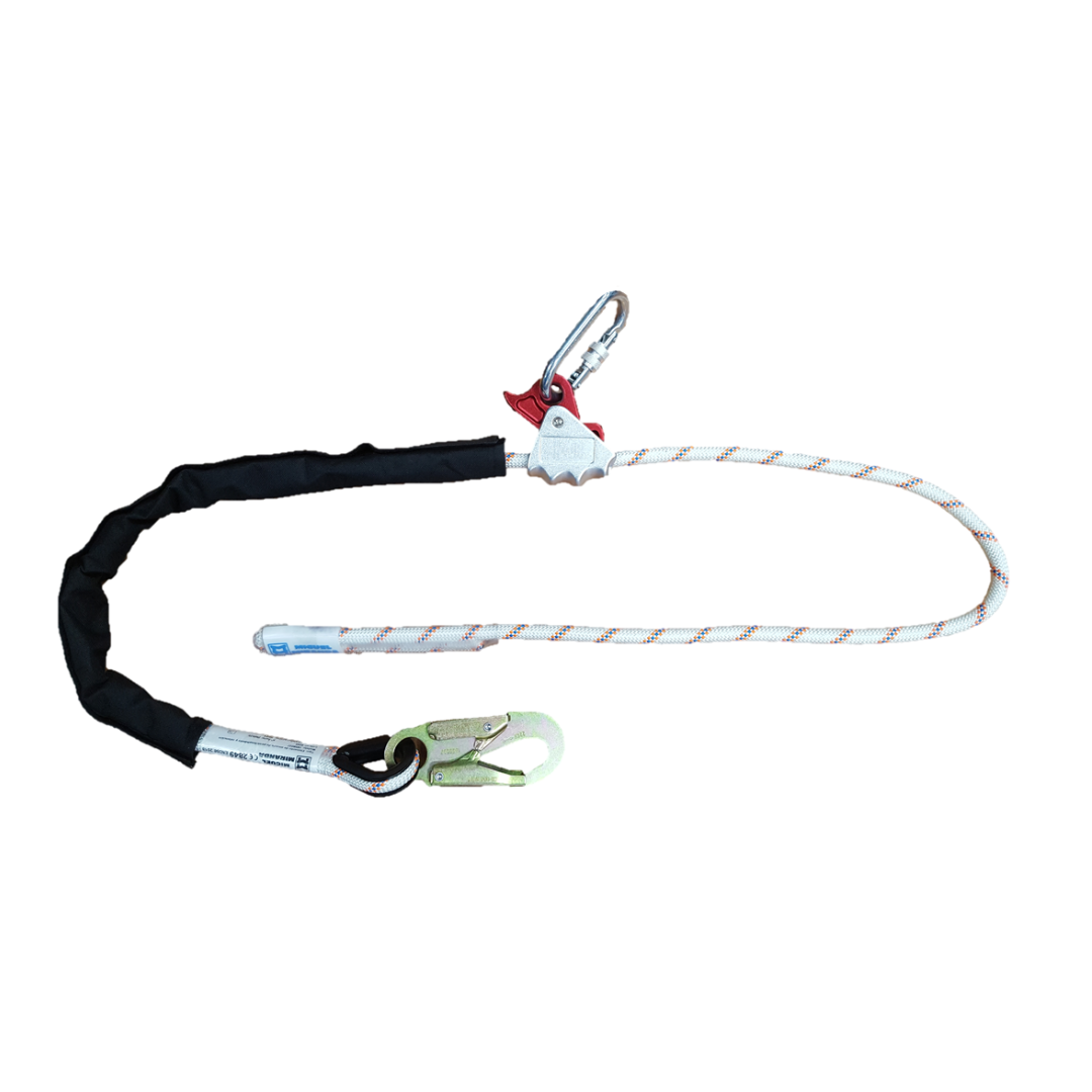 Elemento de amarre 1858037 regulable de 0,50 a 1,80 metros mediante dispositivo de presión fabricado en aluminio, con mosquetón de acero con cierre de virola de rosca, gancho fijo de acero con cierre y bloqueo automático y funda protectora textil.