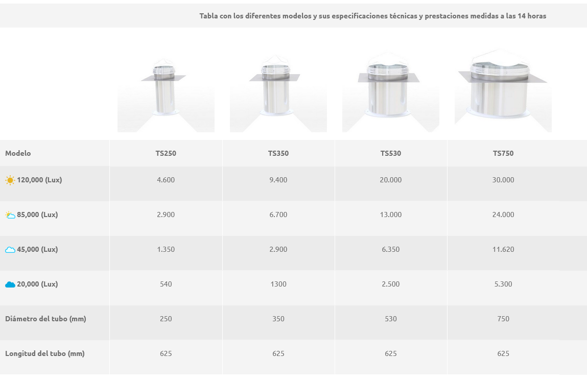 Fabricados en distintos diámetros y capacidades de captación de luz adecuados a entornos industriales o residenciales. Diseñados para ser eficientes energéticamente, se integran perfectamente con la iluminación global de cualquier edificio.